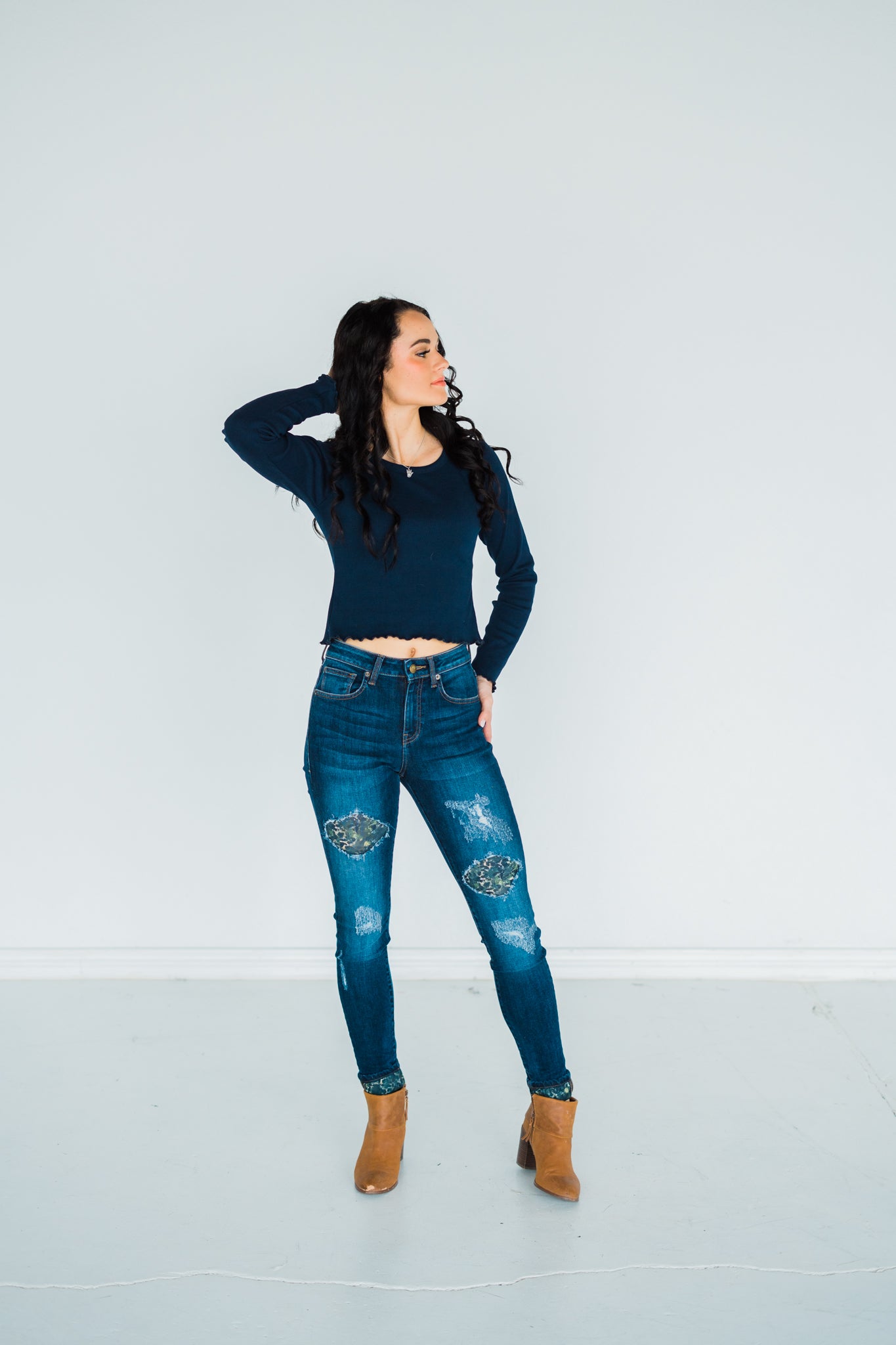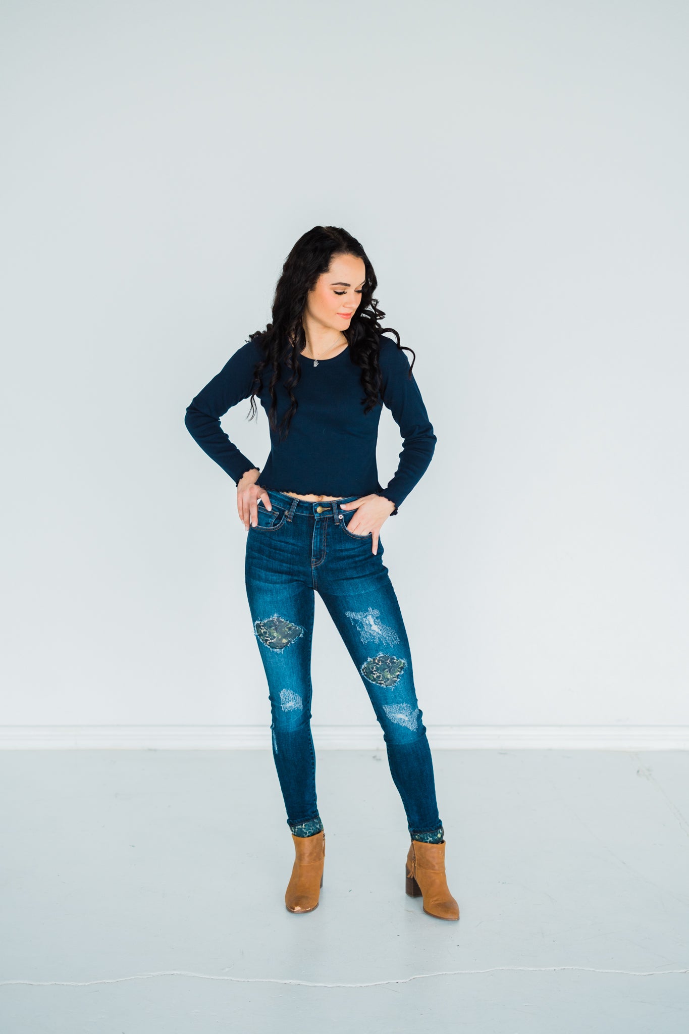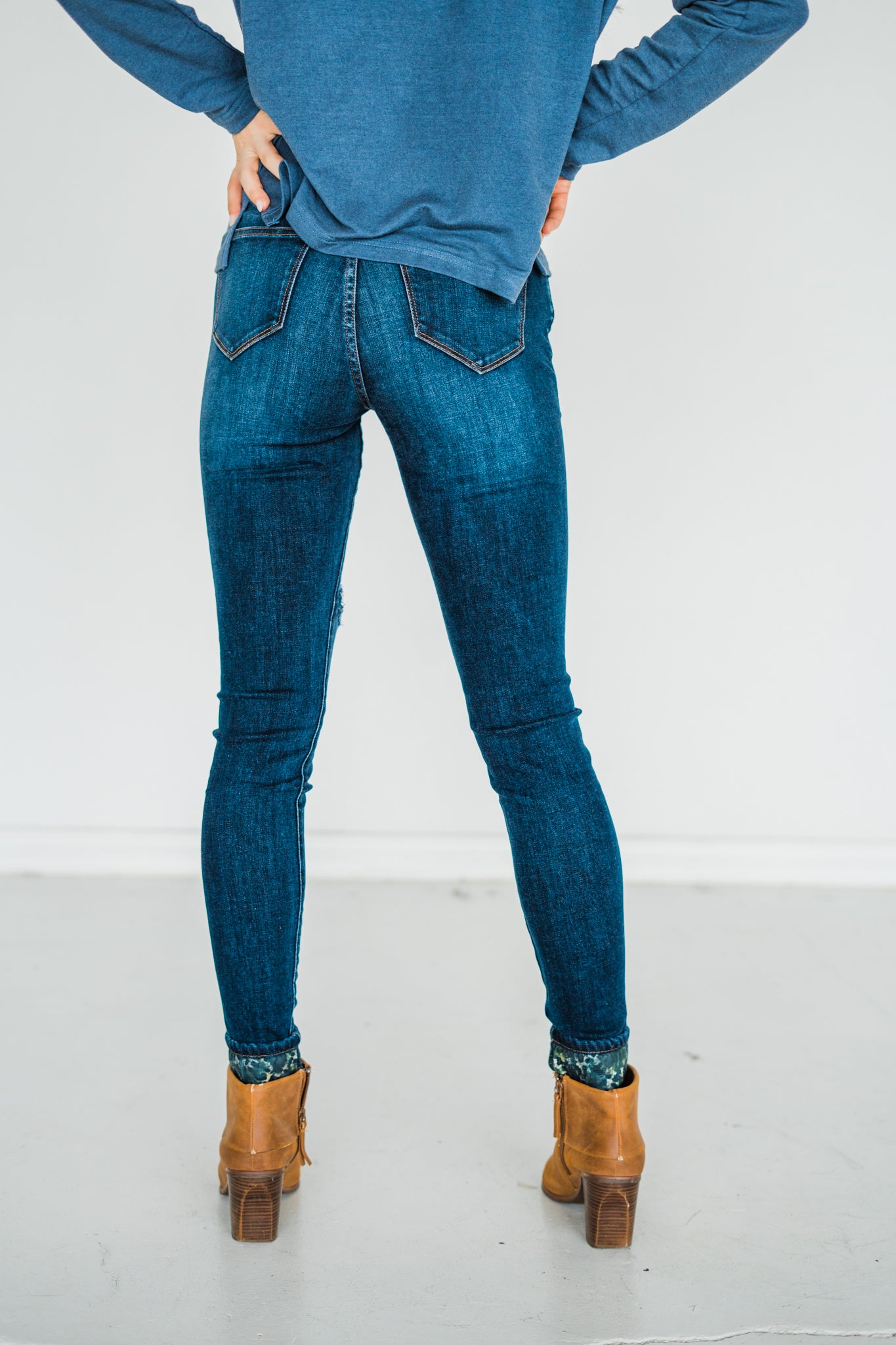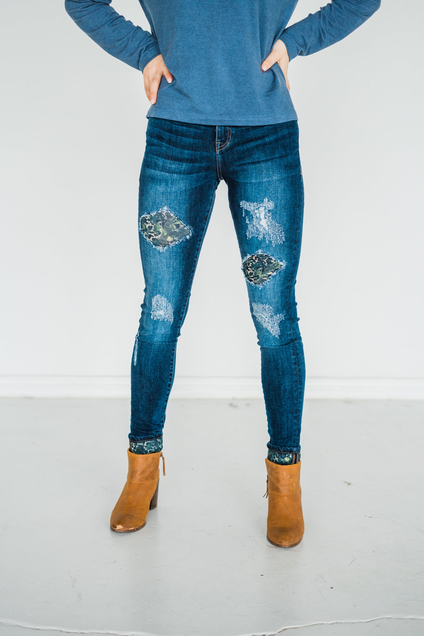 When you can't choose between camo and leopard, these jeans will help satisfy both popular trends! Camo Leopard Patch Distressed Skinny Jeans have a dark wash and matching cuff. You'll find the cuff helpful with various heights because you can increase or decrease the cuff, or even just remove the cuff altogether!