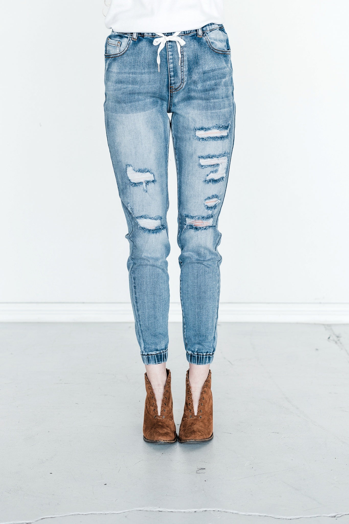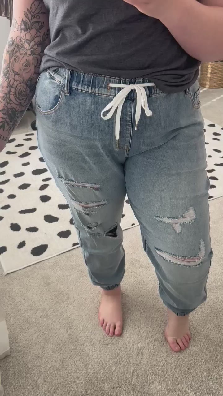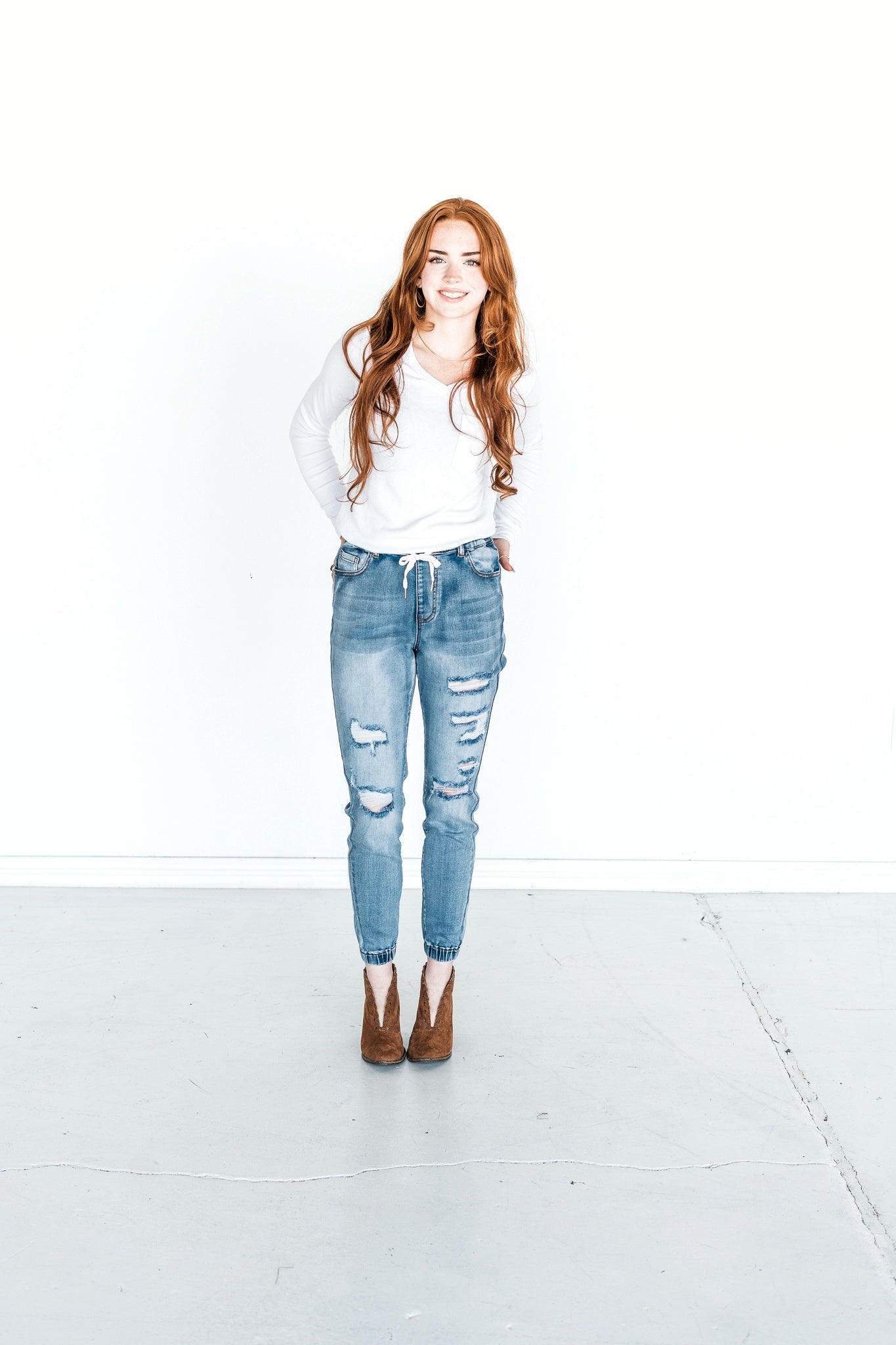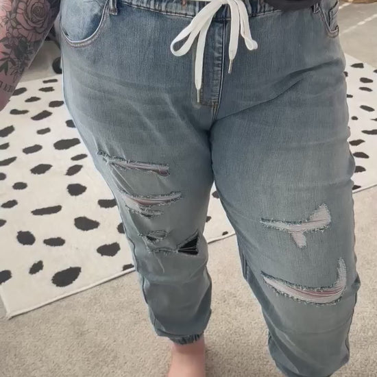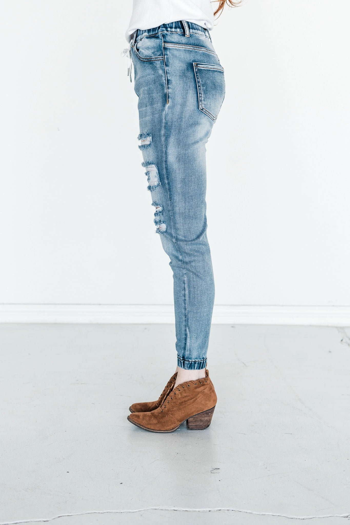 Step into comfort and style with our Distressed Denim Joggers in a Medium Wash. These high-rise denim joggers are designed to effortlessly blend fashion and functionality. Crafted with eco-friendly Lycra denim, they offer a sustainable choice without compromising on style. The distressed detailing adds a touch of trend and edginess, while the soft and stretchy fabric ensures all-day comfort. Whether you're running errands or meeting friends, these joggers will make you feel confident and fashionable.