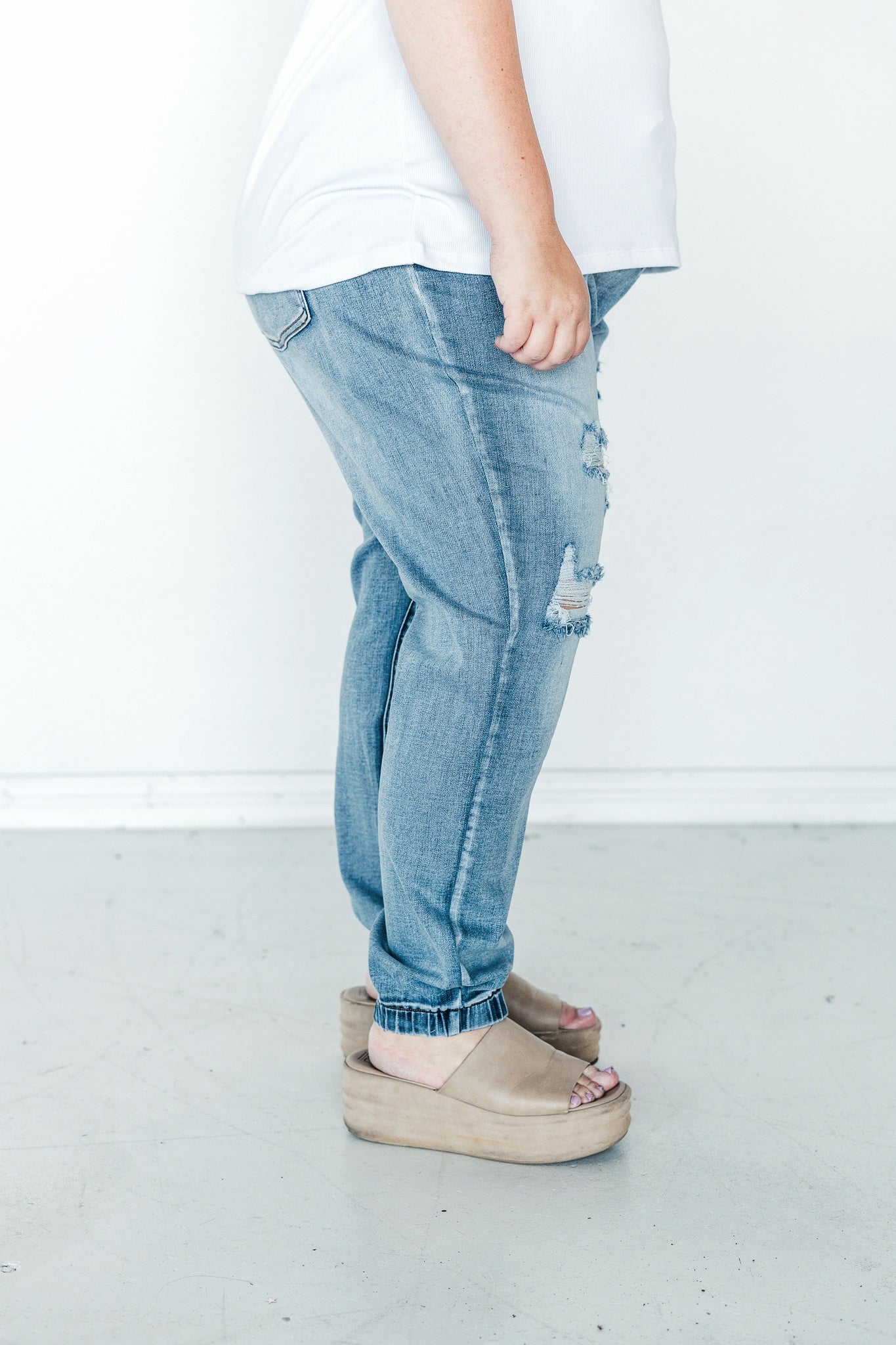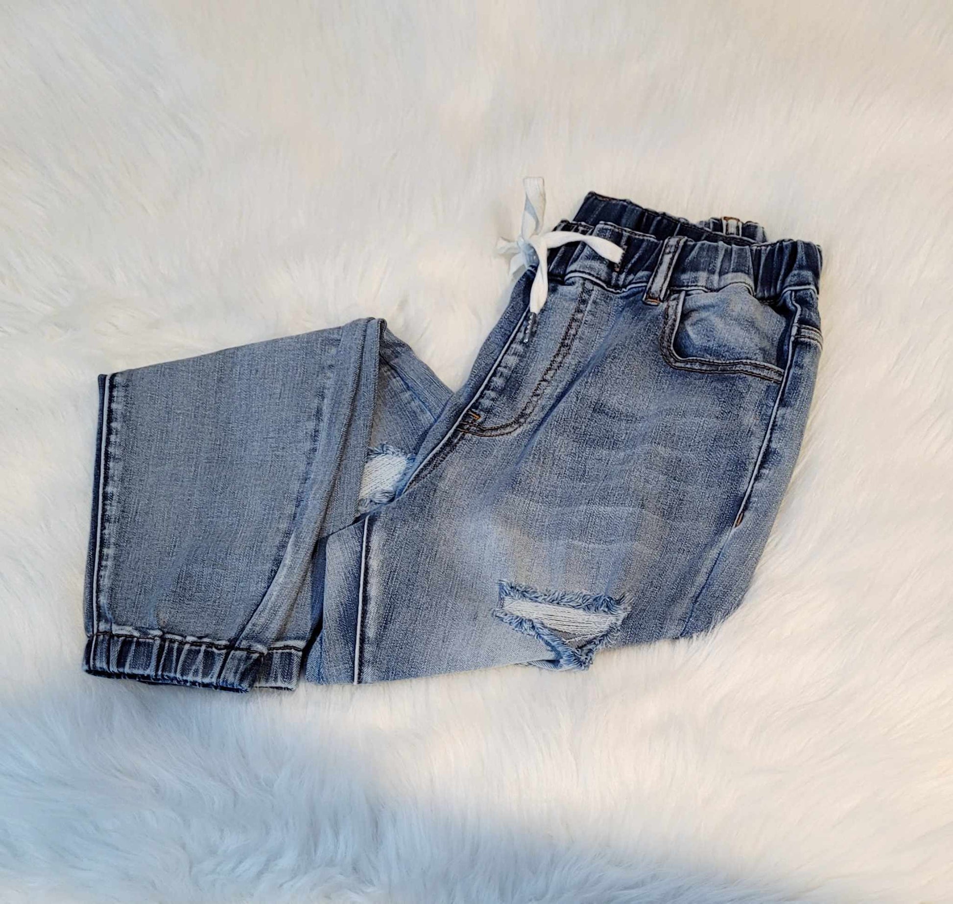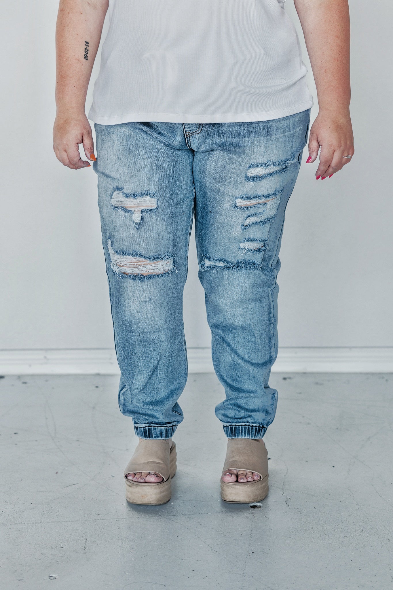 Step into comfort and style with our Distressed Denim Joggers in a Medium Wash. These high-rise denim joggers are designed to effortlessly blend fashion and functionality. Crafted with eco-friendly Lycra denim, they offer a sustainable choice without compromising on style. The distressed detailing adds a touch of trend and edginess, while the soft and stretchy fabric ensures all-day comfort. Whether you're running errands or meeting friends, these joggers will make you feel confident and fashionable.