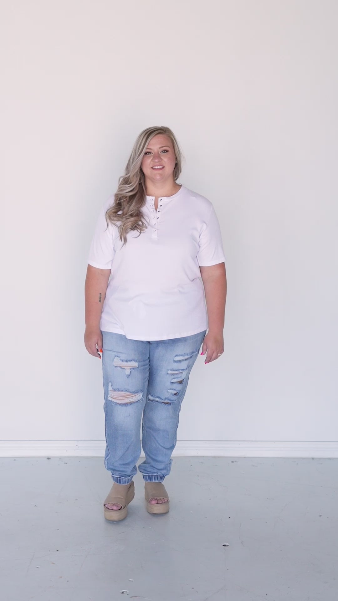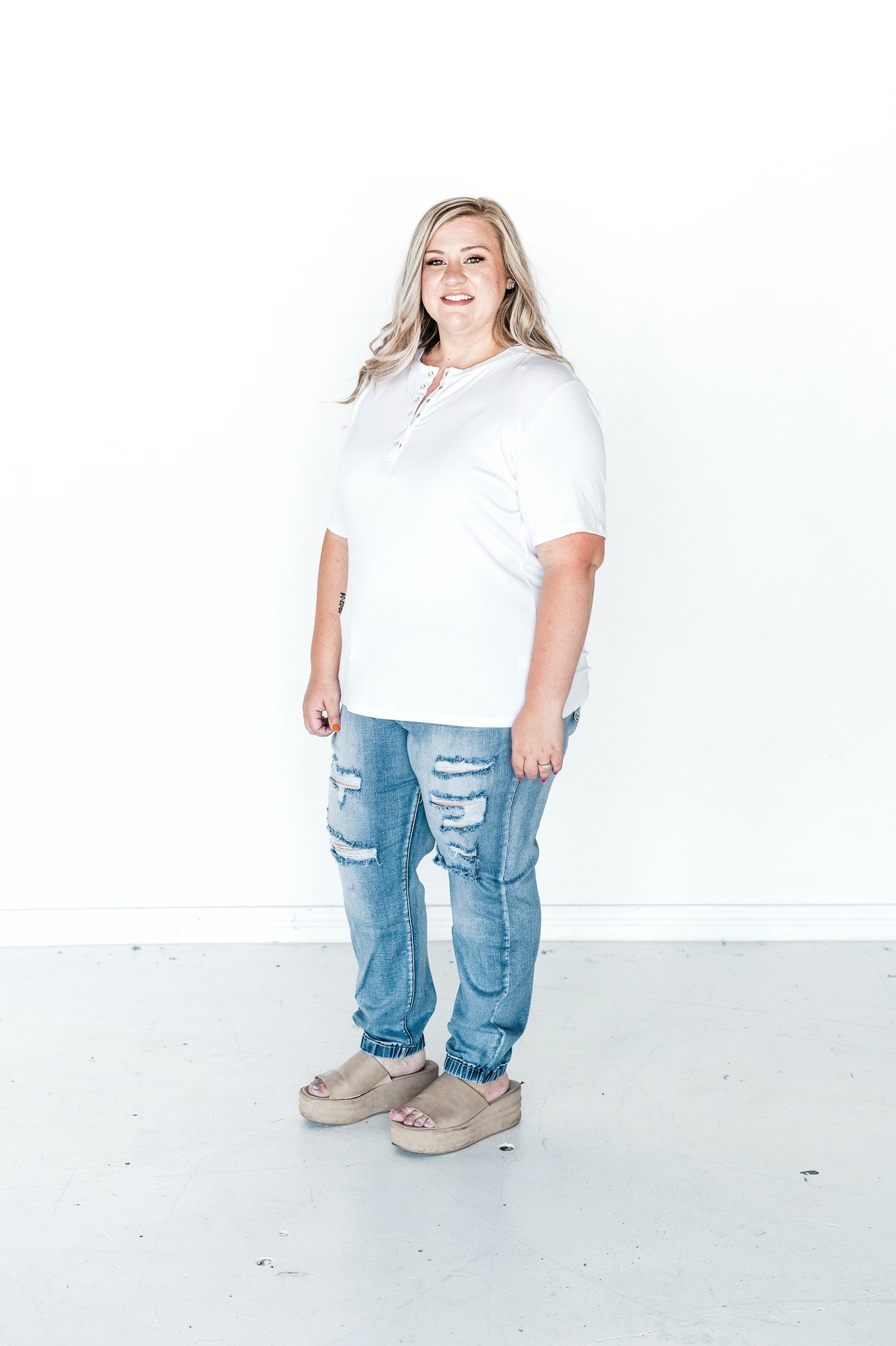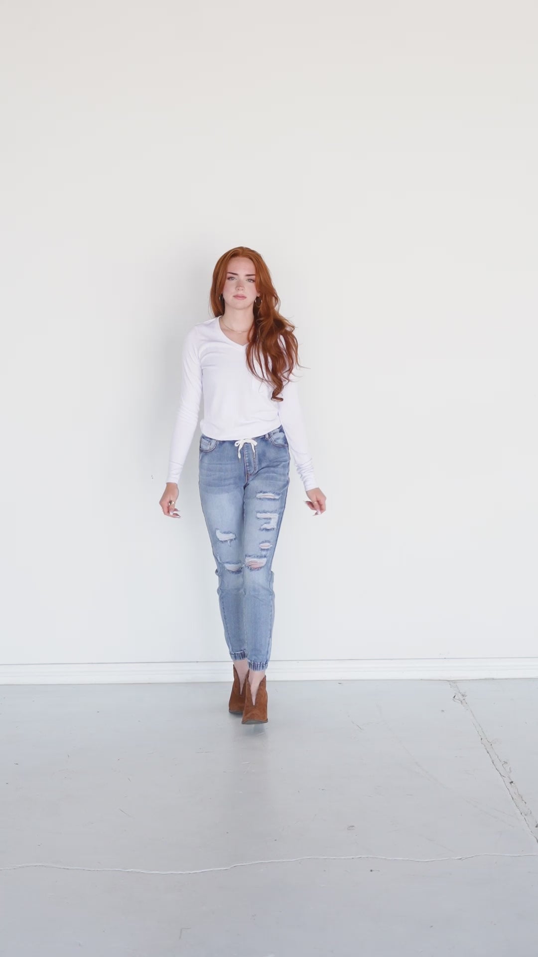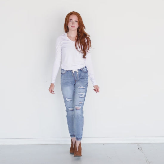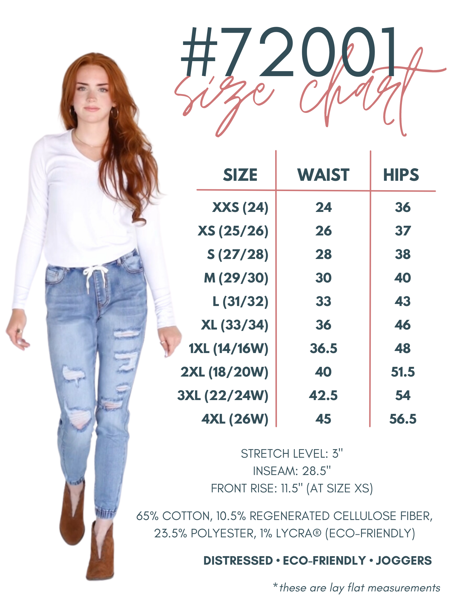 Step into comfort and style with our Distressed Denim Joggers in a Medium Wash. These high-rise denim joggers are designed to effortlessly blend fashion and functionality. Crafted with eco-friendly Lycra denim, they offer a sustainable choice without compromising on style. The distressed detailing adds a touch of trend and edginess, while the soft and stretchy fabric ensures all-day comfort. Whether you're running errands or meeting friends, these joggers will make you feel confident and fashionable.